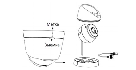 - Произведите демонтаж камеры. Поверните камеру для выравнивания выемки с одной из меток. Подденьте монтажную базу камеры с помощью плоского предмета, например, монеты, чтобы отделить её от корпуса камеры;