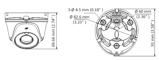 Камера HiWatch DS-T123 (6 mm) оснащена переключаемым видеовыходом HD-TVI/CVBS. Питание — 12 В DC ±15 %. Потребляемая мощность — 4 Вт. Размер — Ø 82.6×69.66 мм, вес — 230 г.