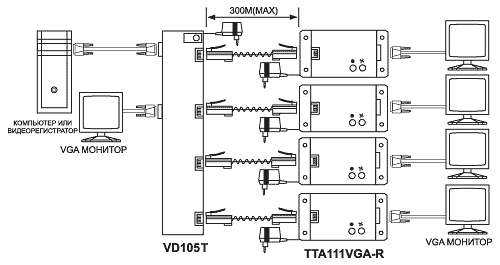 SC&T VD105; Распределитель 1 VGA вход на 5 выходов (1 VGA+4 RJ-45). Макс.разрешение 1600х1200 пикс. при 85Гц. Каждый комплект включает в себя передатчик VD105VGA-T с адаптером 220/12 и приемник TTA111VGA-R с адаптером 220/12.Использование кабеля CAT5 вместо VGA кабеля, передача до 300 м