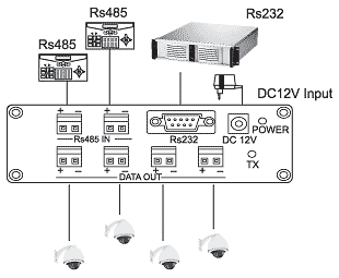 SC&T RS004; Разветвитель данных 1 входящий на 4 исходящих. Вход: RS232 или RS485, выход RS485. Дистанция передачи 1200 метров по витой паре. Возможность каскадного соединения с другими устройствами RS004/ RS008/ RS016.